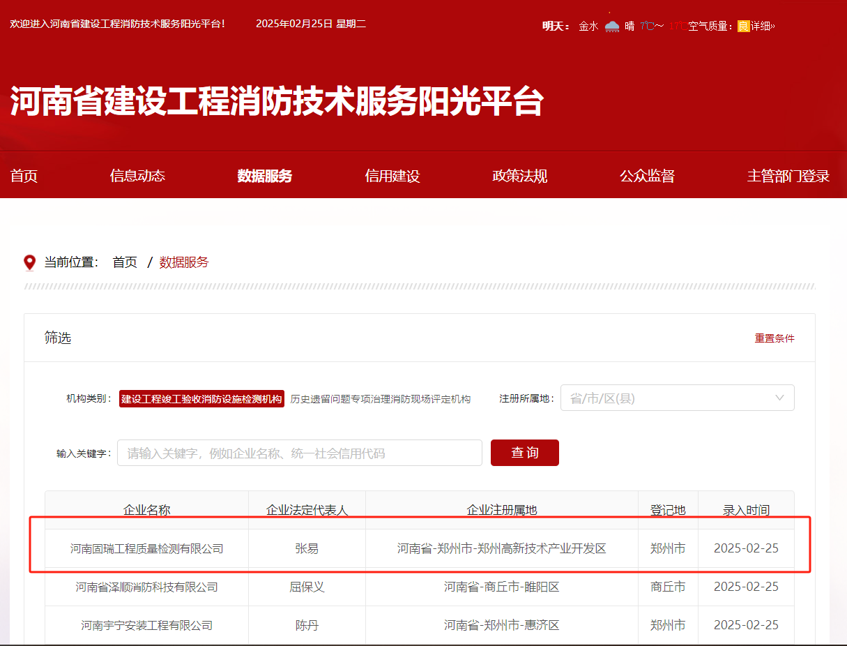 熱烈祝賀河南固瑞工程質(zhì)量檢測有限公司入冊河南省建設工程消防技術(shù)服務陽光平臺!!!