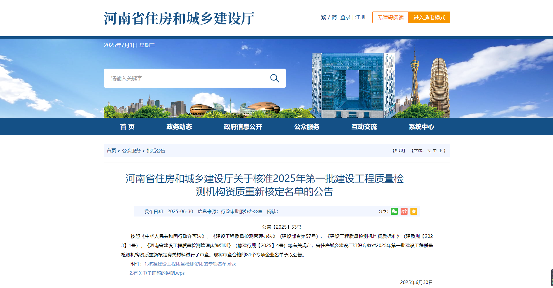 熱烈祝賀我司通過河南省住建廳2025年第一批建設工程質(zhì)量檢測機構(gòu)資質(zhì)重新核定!!!